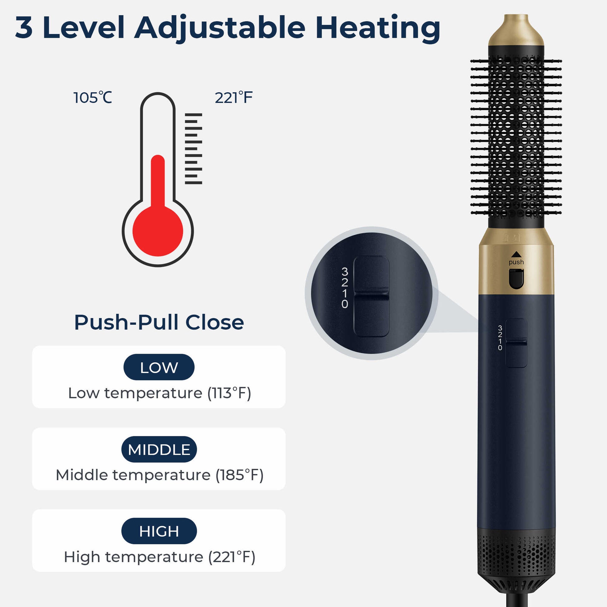 - Temperature Setting: 45±5℃, 85±5℃, 100±5℃ (The low heat setting gently cares for fine or damaged hair, while the high heat setting efficiently styles thick, coarse hair.)