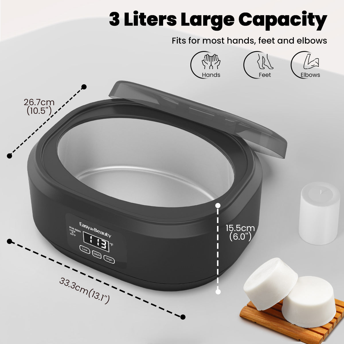 New modern black finish! Designed for efficiency and performance, EasyinBeauty Paraffin Wax Machine is your all-access pass to silky, smooth, and deeply moisturized skin on your hands, feet, and elbows, all from the comfort of your home.