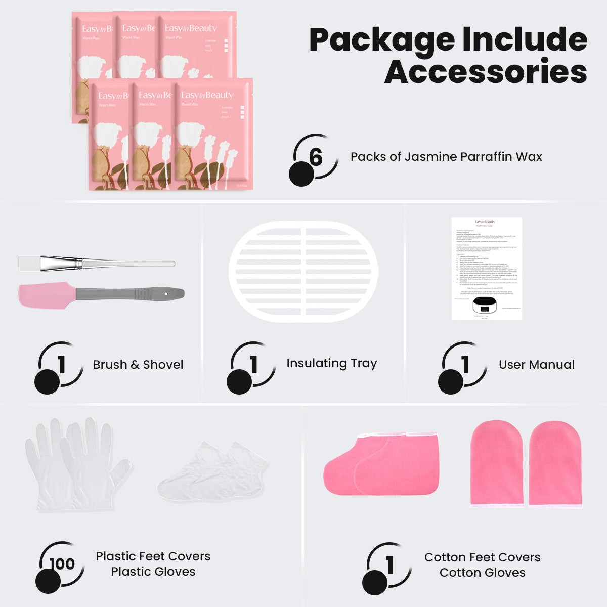 Complete All-in-One Kit:Â We provide everything you need to get started. This comprehensive kit includes 6 packs of jasmine paraffin wax, cotton gloves and booties, plastic liners, a brush, and a shovel. It's a complete spa solution in one elegant package.